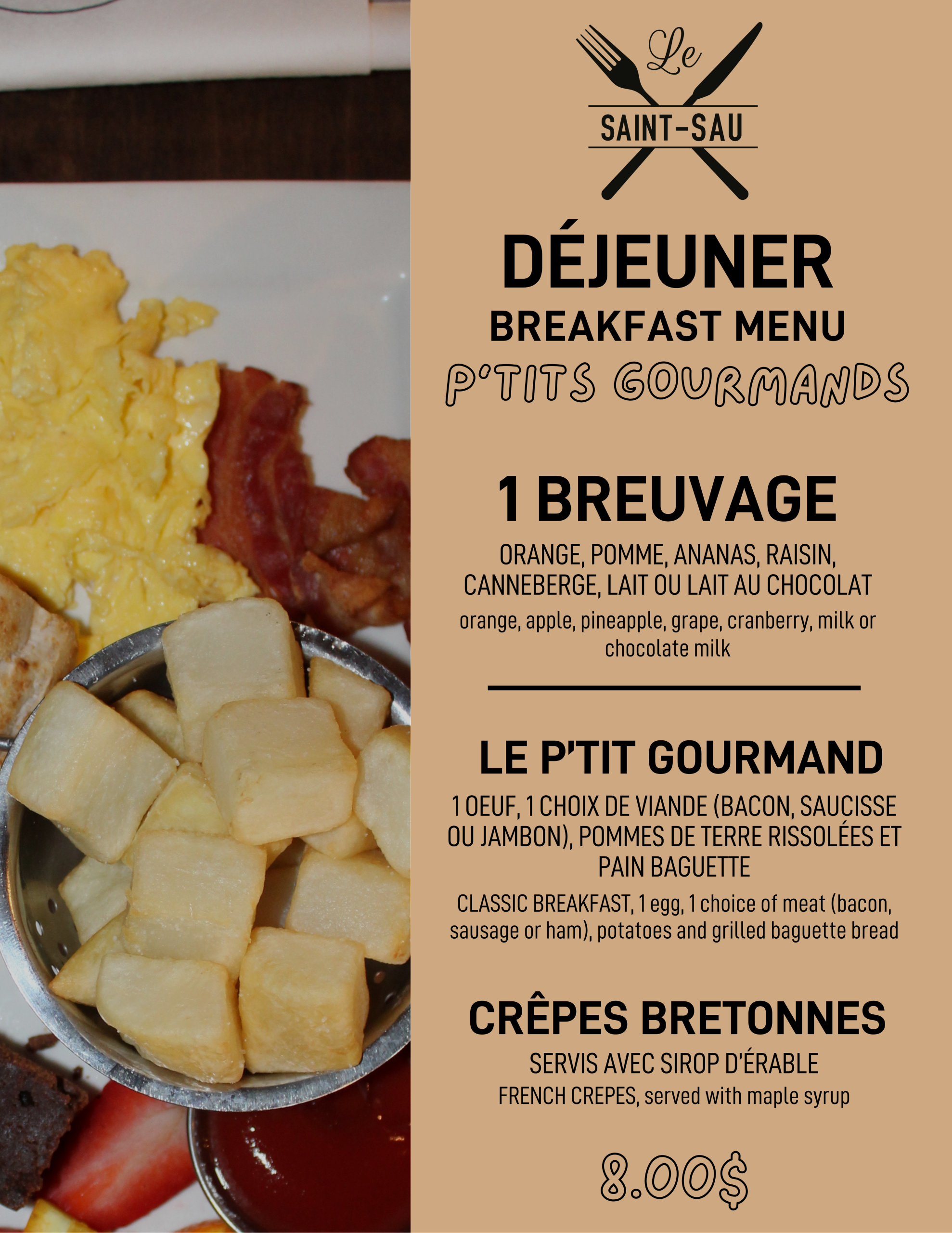 Menu déjeuner du Saint-Sau Pub Gourmand à Saint-Sauveur, offert 7 jours sur 7 : un choix gourmand et délicieux pour bien commencer la journée dans les Laurentides.